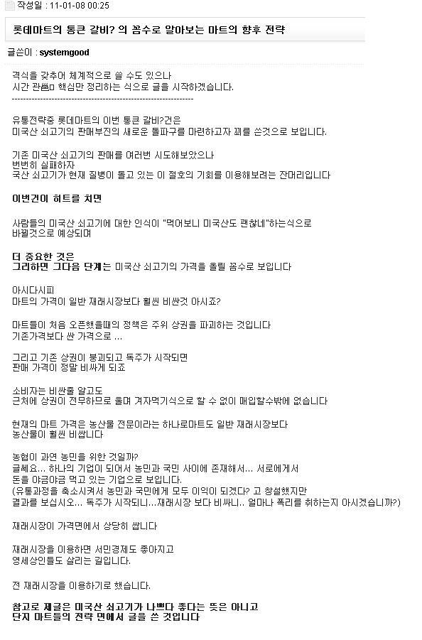 국산 쇠고기가 무조건 질이 좋다고 믿는건 종북주의자들이 주입시킨 종교적 맹신입니다. 신토불이는 산업이 아니고 돈이 아닌가요? 비즈니스가 아닌가요? 겉만 보고 신토불이가 최고..? 물론, 한국인에게는 쌀밥 처럼 지역적 특수성이 존재하는 경우도 있겠지만, 미국 쇠고기가 한국 쇠고기보다 무조건 품질이 떨어지는데 그들이 부당한 방법으로 품질을 왜곡해서 시장을 교란하려 한다는 식으로 조작 선동해대는 한결례의 주장에 근거를 불어넣이주는 글을 마주하고 있는 것 같아 씁씁합니다. 이건 아이폰대 갤릭시S... 같은 시장보호의 차원을 넘어선 문제입니다. 자본가 기득권자 양키 대 대한민족 간의 싸움입니다. 엄청난 명분이 걸려있는 사건이라고 생각합니다. 그러나 이 사건이 우익에게 트랩이라고는 생각하지 않습니다. 소고기에 걸려있어 극단적으로 인식될 뿐, 싸게 사서 적재적소에 싸게 팔아 이윤을 남기는 상인의 행동일 뿐이고, 이런 일은 어떤 품종 마켓에서도 항상 일어나고 있는 일이니까요. 매스컴과 언론이 꼭 '미국'산 쇠고기에만 민감하게 반응하면 꼴을 보면 이미 광우집회가 광주혁명처럼 적화통일의 코드로 의식화되어가고 있다는 것을 절실히 느낍니다. (이념적으로 성역화되고 있는...)