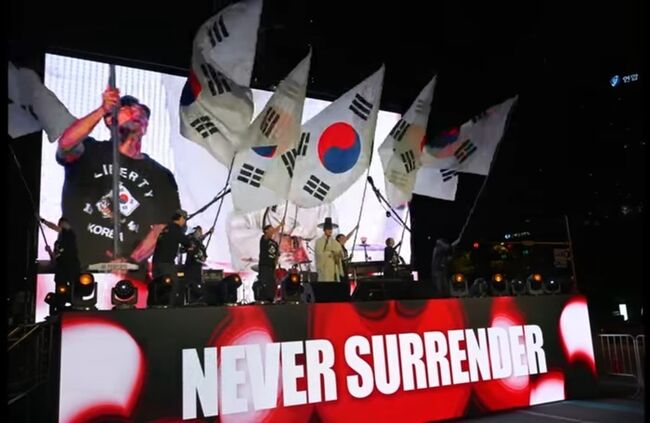 지난달 3일 자유대학 주최 집회 무대에서 선보인 태극기 퍼포먼스. / 사진=청년의소리TV 영상 캡처.