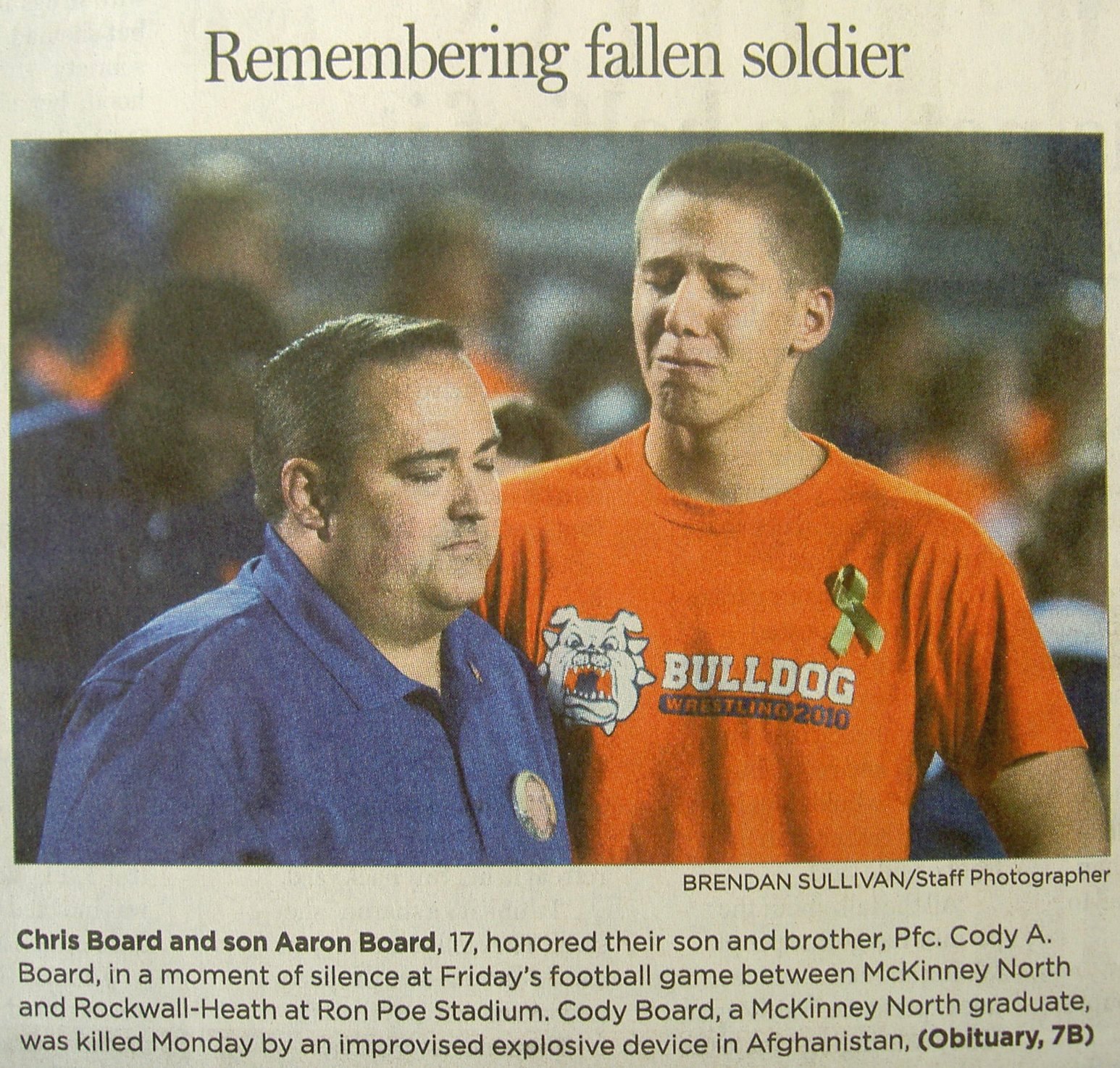 추모식에 초대된 병사의 아버지와 동생. 경기시작전에 모두 묵념을 하는 모습. 오늘아침 달라스모닝뉴스 신문의 지역란에 게제된 사진임."우리는 모두 한가족이며 가족의 일원을 잃었습니다. 우리는 코디가 국가를 위해 희생한 것을 알아주는 것이 중요합니다. 그리고 우리가 할수있는 한 모든 방법으로 경의를 표합시다." 이말은 풋볼코치가 한 말입니다. 월요일에 순직한 보드병사는 다음날인 화요일이 생일날이었다고 합니다.
