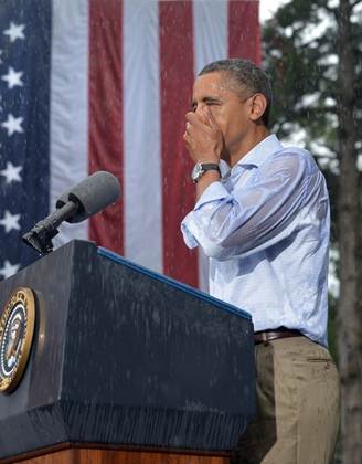 보트 타는 롬니와 빗속의 오바마